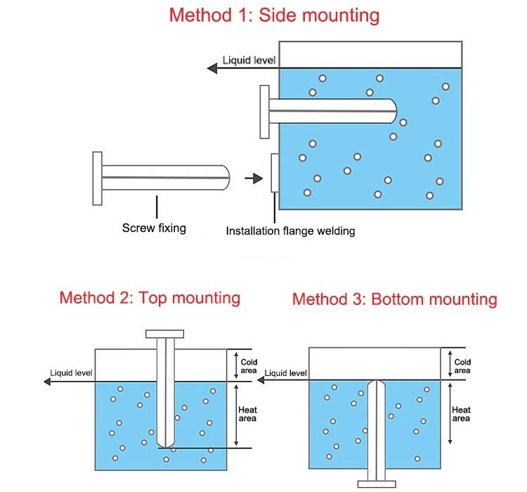 For top-mounted installation, pay attention to the length of the cold zone to avoid local hightemperature that may burn the heating tube